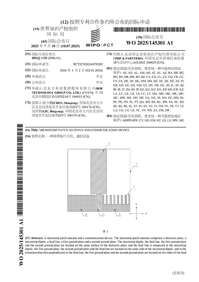 京东方A公布国际专利申请:“一种微带贴片天线、通信设备”